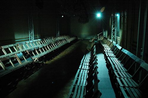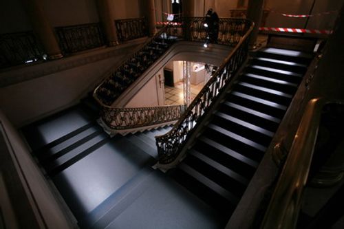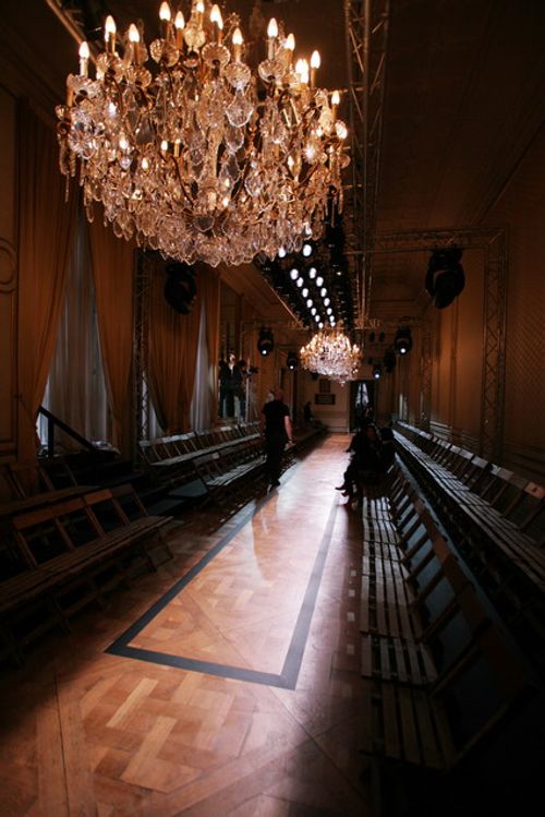 The catwalk makes use of modern industrial materials to contrast the showspace venue – a period hôtel particulier on avenue Foch in Paris. Aluminum, Rubber and Masking Tape add new structures and surfaces used strictly for their utilitarian purposes: as support structures, outlines and protective surfaces. The linear runway, outlined in black masking tape and lit sharply from above, continues the utilitarian theme, using standard techniques in the generic presentation of fashion.