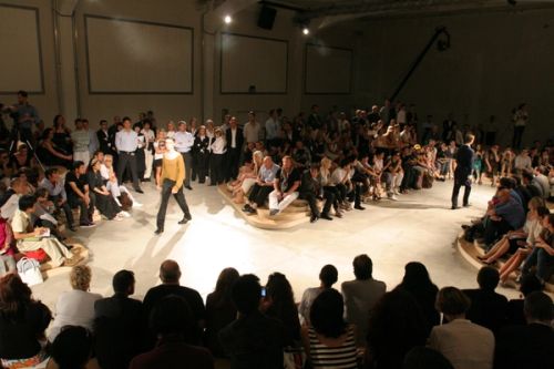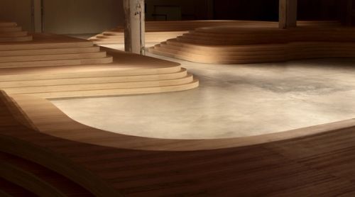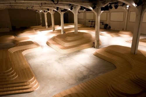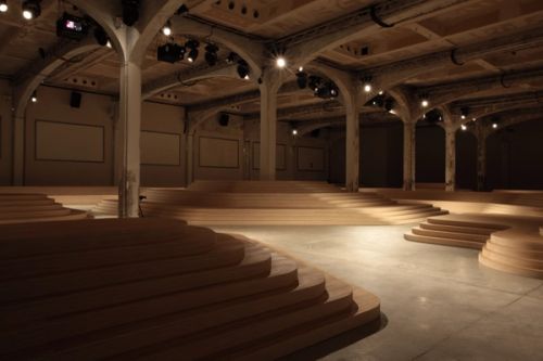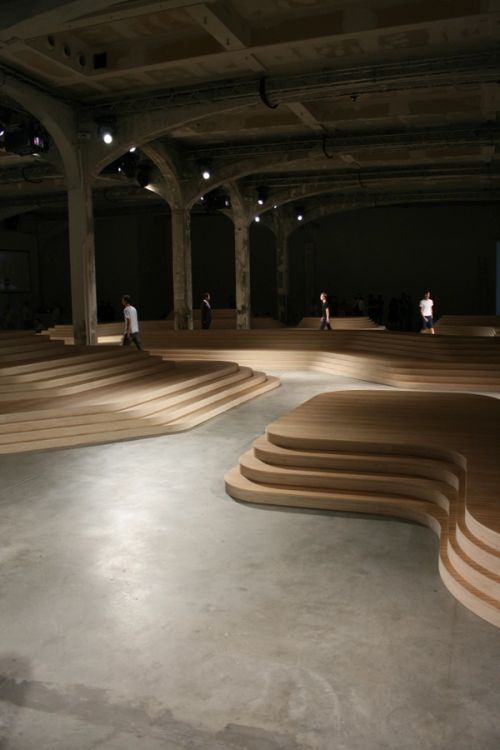 In an effort to dissolve the rigid configurations of the traditional runway, Prada/AMO proposes an Archipelago of irregular wood isles for the presentation of the Men's Spring / Summer 2009 collection in Milan.