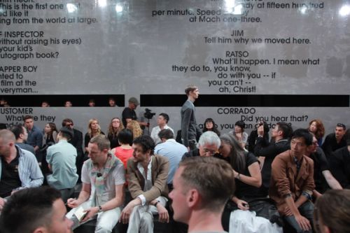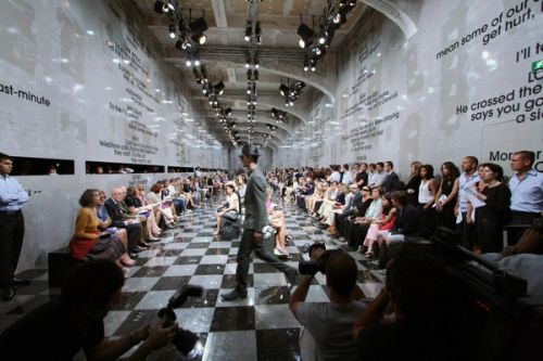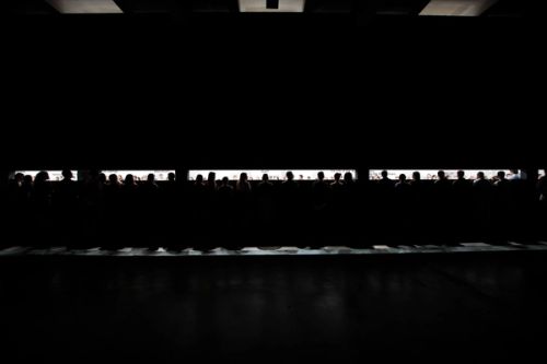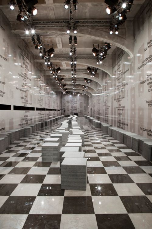 The wall appears as a strange, black border. It marks a net transition between the empty space of the room and the moment of the show. It is a time gate to the fashion experience.