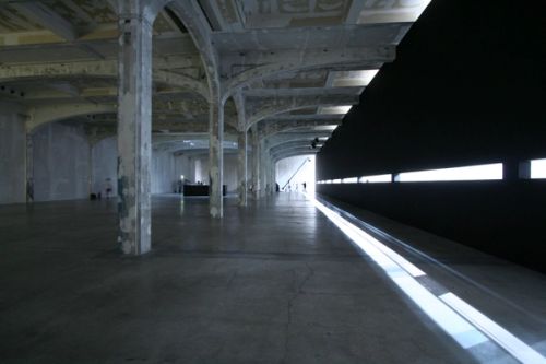 The linear catwalk is hidden between one edge of the existing room and a new seven meter high wall. From the entrance, the dark space looks completely empty.