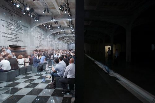 The catwalk is visible from the main room through a narrow slot in the wall. It frames the view of the fashion show.