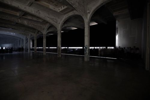 Only a slot of intense light reveals the linear show space behind the wall, accessible to the selected audience through a small opening, similar to a secret passage.