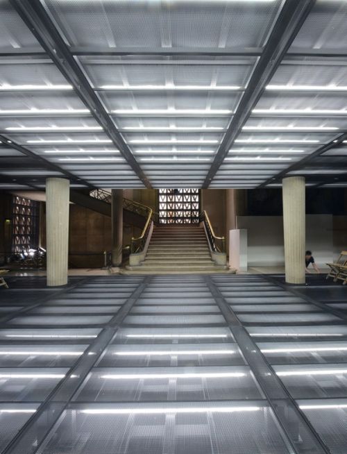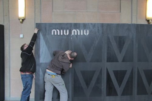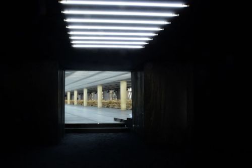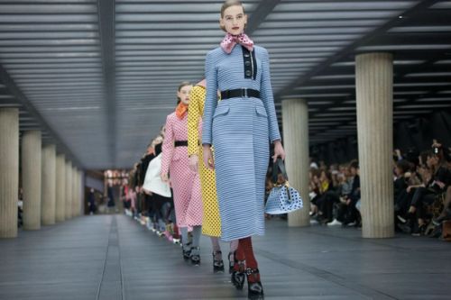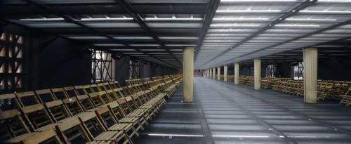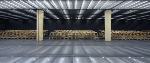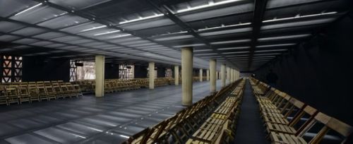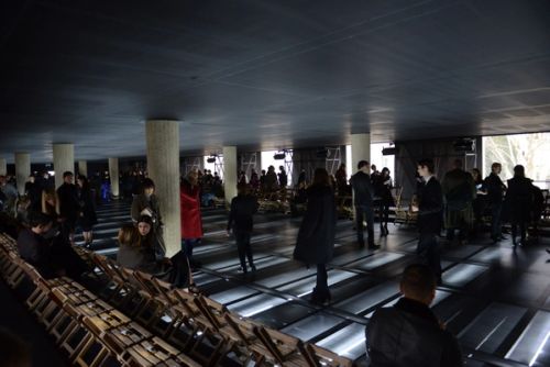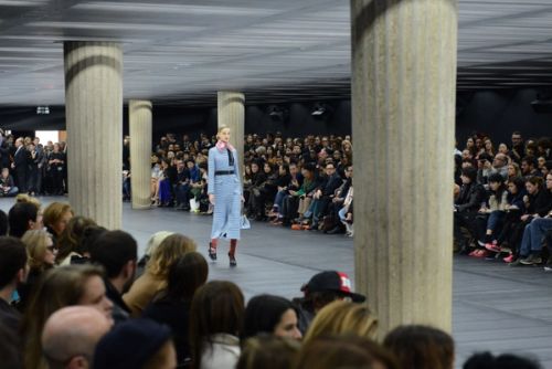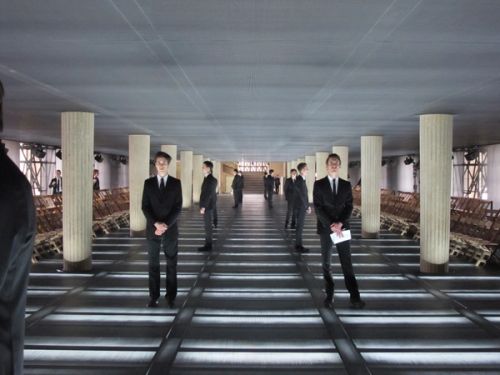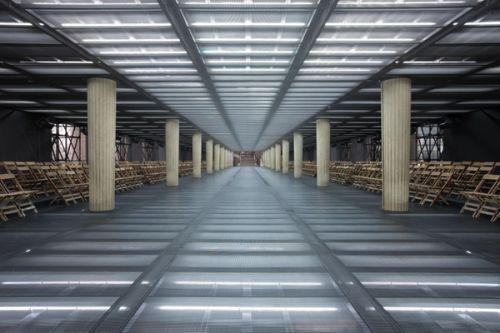 Once again the design of the MiuMiu FW 2013 show offers the opportunity to investigate the monumental architecture of August Perret's Palais d'Iena. The catwalk is designed as a deep compressed space, extending across thesalle hypostyleof theConseil Economique, Social et Environnemental; The audience is organized conventionally along the linear catwalk.