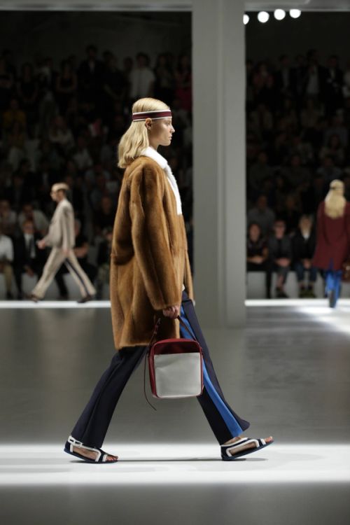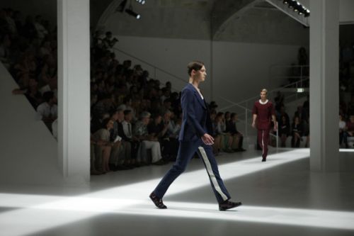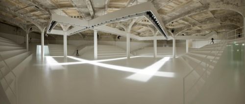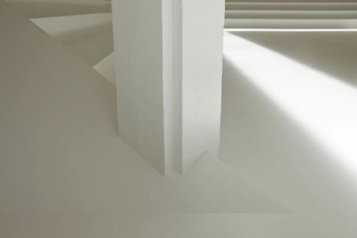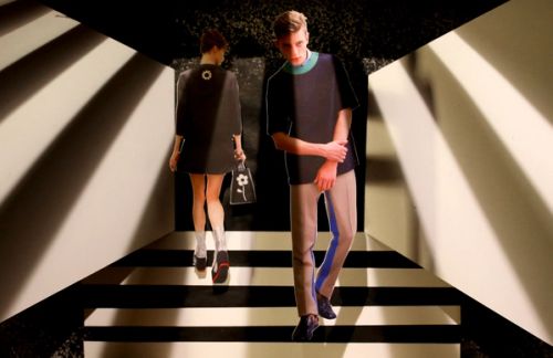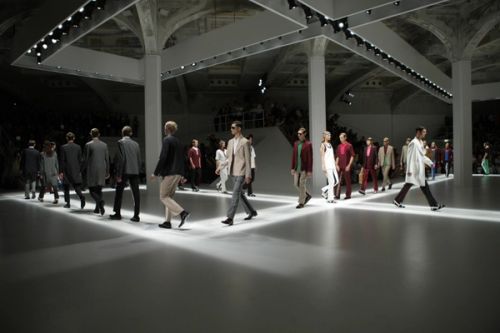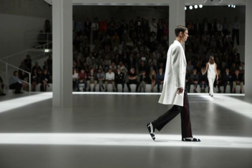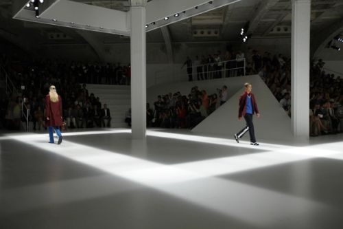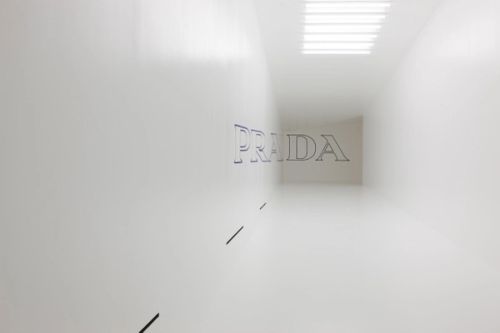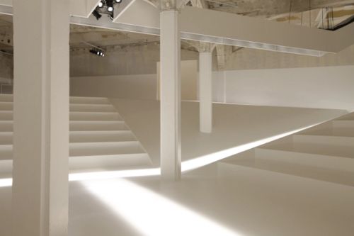 The space for the AMO-designed Spring/Summer Prada catwalk show is conceived as a white modernist composition of shifting geometrical forms.