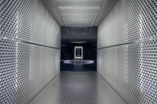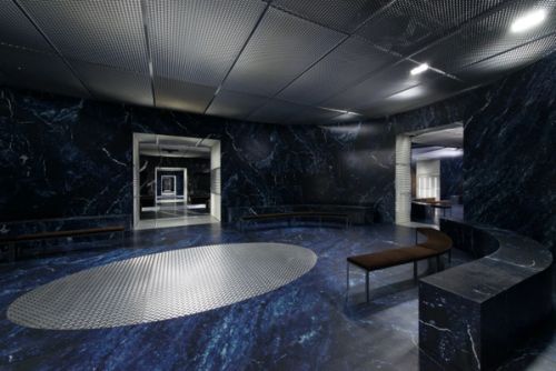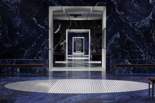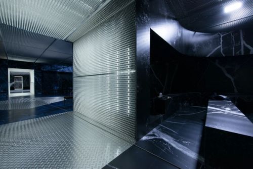 The existing room is disguised into a classic enfilade of rooms, gradually changing proportions as in an abstract mannerist perspective. As opposed to a single stage, the new sequence of spaces multiplies and fragments the show into a series of intimate moments.