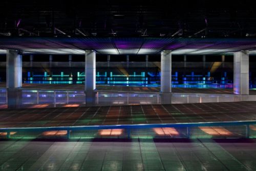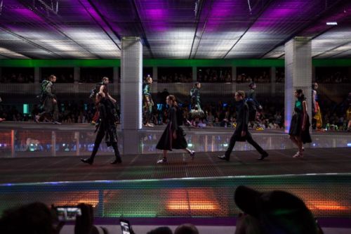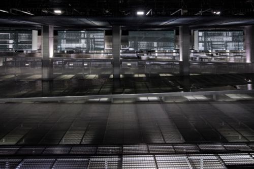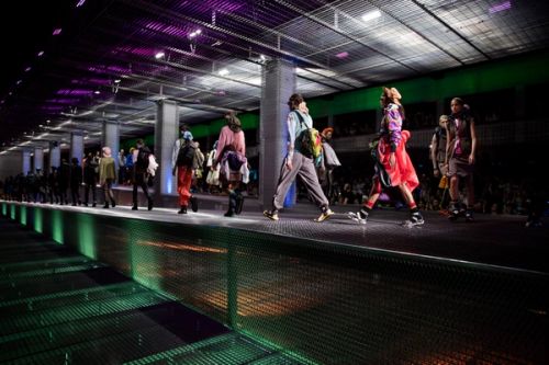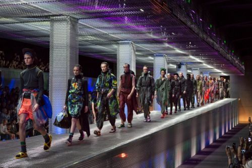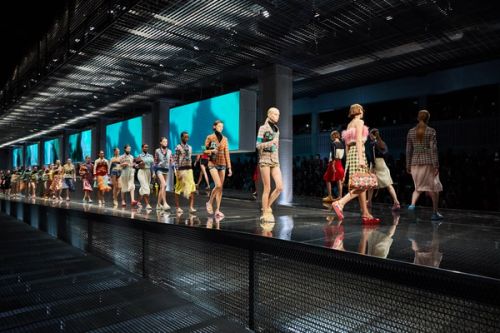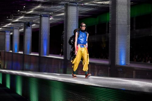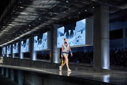 The set for the Spring Summer 2017 Prada show designed by AMO is conceived as layers of diverse architectures. The new space is built over the remnants of the previous season which serves as both a foundation, and visible background, for the current scenography.