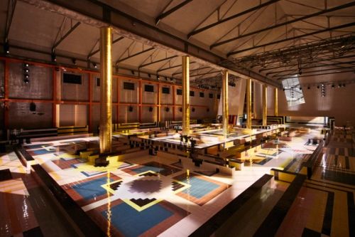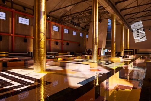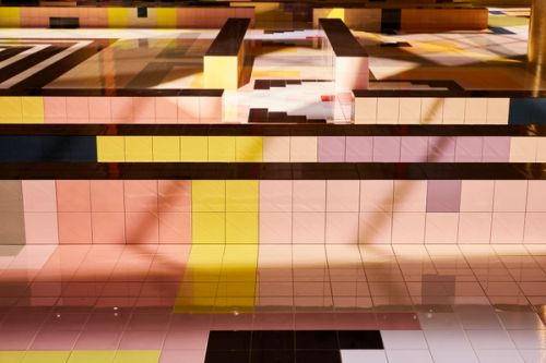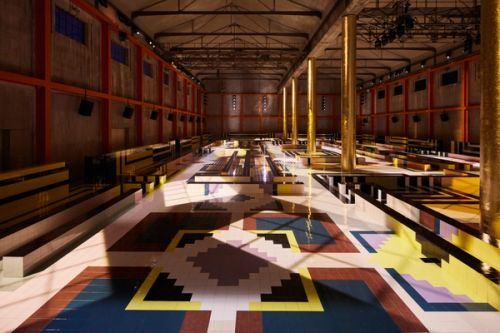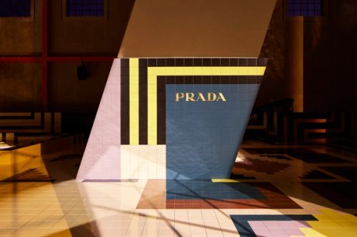 For the 2020 Spring/Summer Prada Womenswear show, AMO designed a vibrant and colorful geometrical pattern enfolding across the hall of the Fondazione Prada’s Deposito, infusing it with a summery glow.