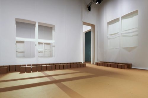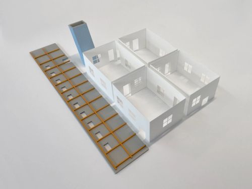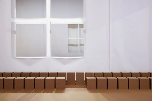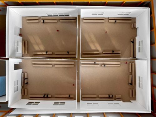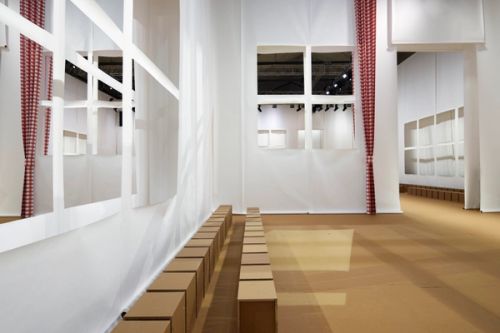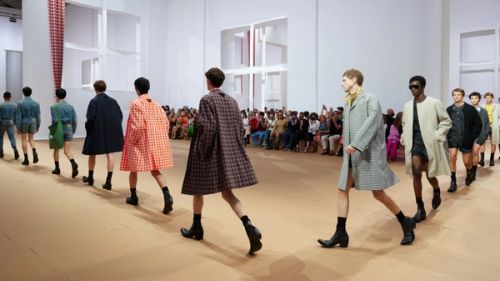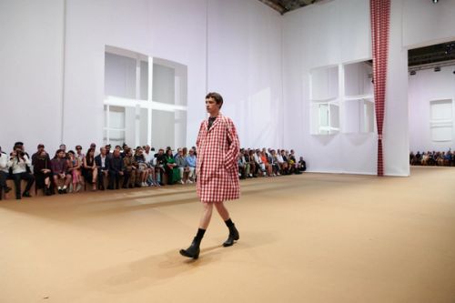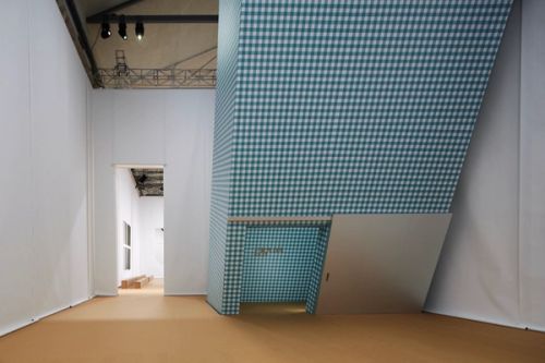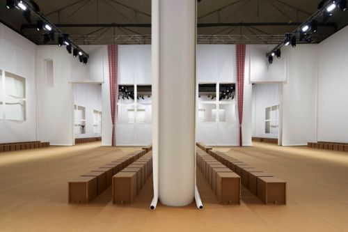 For the Prada Spring Summer 2023 menswear show, AMO has designed a set in the shape of an abstracted paper house.