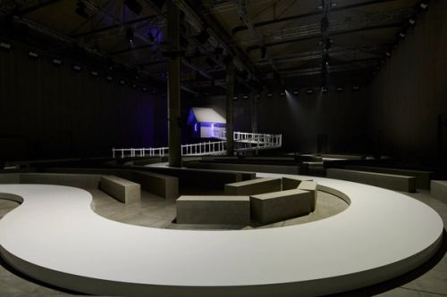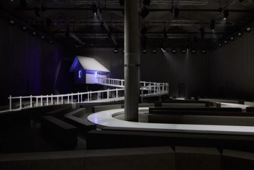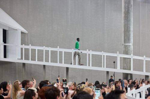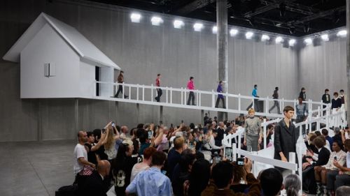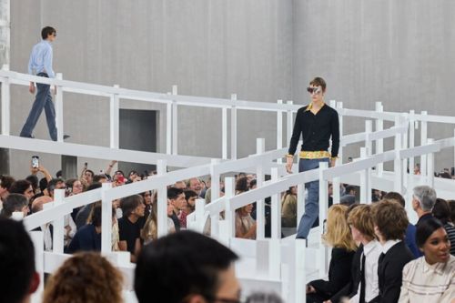 The set design for Prada’s Spring/Summer 2025 menswear show is inspired by the idea of primordial simplicity. A humble hut, the sort of hut you find in fairy tales, stands three meters high above the floor as if on an imaginary hill. From the hut, models emerge in a seemingly unending procession, like in a surrealist film of avant-garde cinema. They descend a sinuous path bordered by picket fences, which further weaves into the audience, bringing models and spectators in close proximity. A ten-meter-tall concrete wall frames the set and obscures any reference to the outside world. The hut’s white, glossy appearance is deliberately at odds with its rustic detailing, introducing tension between two ostensibly non-antagonistic concepts: purism and authenticity.