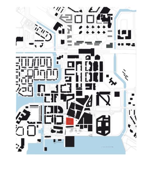 In the overall waterplant for Almere, Block 6 sits in between the entertainment oriented waterfront and the dense shopping carré. Together with the wedge-shaped apartment block in front (Blok 6A, designed by van Sambeek & van Veen), it forms a larger whole. On the pedestrian level as well as in the garage, it is surrounded by passages which connect the different parts of the new city centre. The garage slips under the building, reducing its footprint.