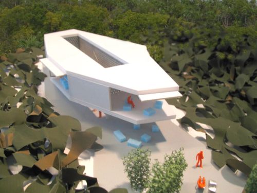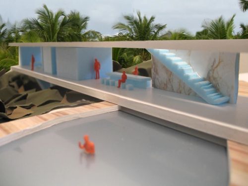 Located on top of the hill, perpendicular to the slope and cantilevers out on both sides, OMA proposed 2 different strategies for a summerhouse. Both designs are very rigid, yet the appearance of the house is very modest. It is barely visible from the road but has maximum views towards the sea.