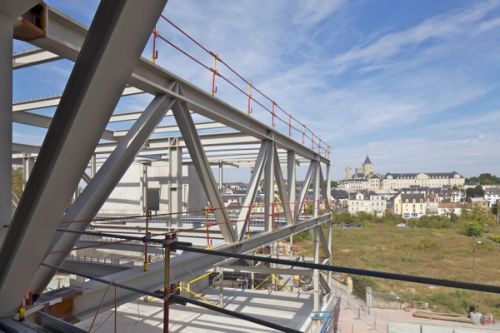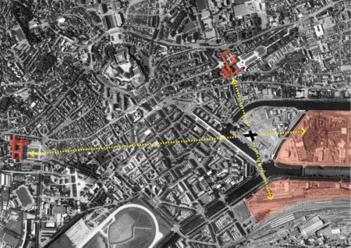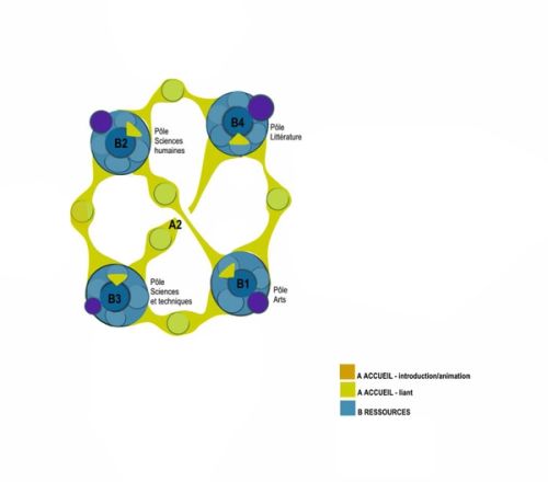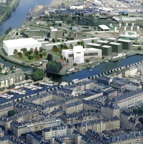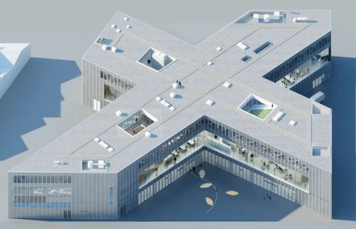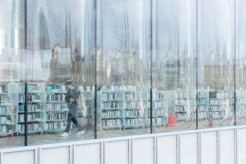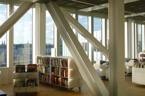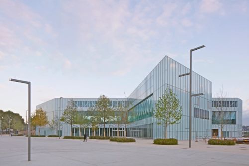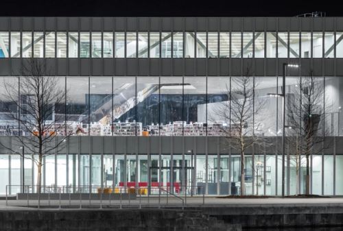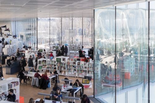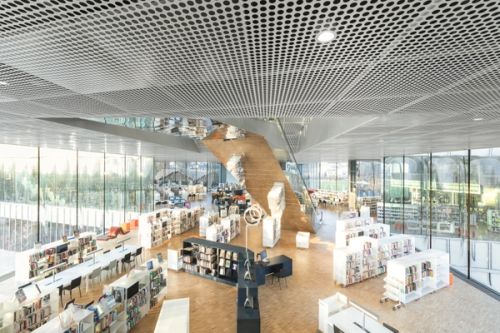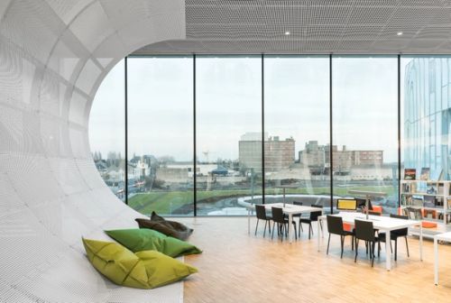 Bibliothèque Alexis de Tocqueville is a public library for the metropolitan region Caen la Mer in Normandy, France. The 12,000 m2 multimedia library is located at the tip of the peninsula that extends out from the city of Caen to the English Channel. Its key position – between the city’s historic core and an area of Caen that is being developed – supports the city’s ambition for the library to become a new civic center. The library’s glass facade visually connects the adjacent park, pedestrian pathway and waterfront plaza to the interior and together with two large ground floor entrances at both sides of the building, enables a fluid interaction of the library with its surroundings. On the upper floors, the urban belvedere provides unobstructed views in all four directions.