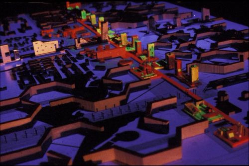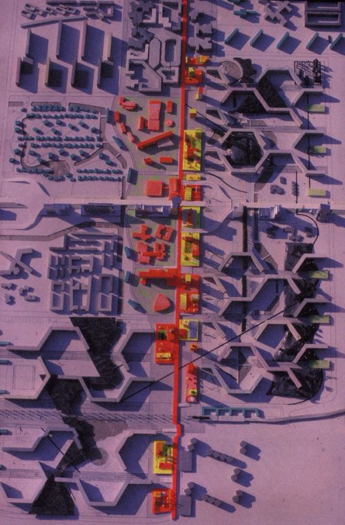The project for the Bijlmermeer consists of a proposal for the renovation of the urban pattern of a grid, a truly modern extension for social housing, in the southeast of Amsterdam. When we started the project it had become fashionable to have an apocalyptic view of the Bijlmermeer and even on the highest levels of decision making, the demolition of important parts of the scheme was considered acceptable. We looked at it in a positive manner, appreciating the repetition of elements and its large scale. At the same time we considered this monotonous beauty the very basis of a problematic; on the scale of a provincial town, urban living had been reduced to such completely innocent activities like fishing, walking and bathing.