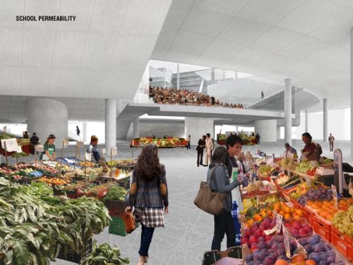 A major route connects to the old campus, becomes cafeteria, student lounge and workspace, bridges the pools, forms the entrance to the gymnasium, and links the "amphitheatre" through the sports arena. The entire complex is permeable for the activities of the surrounding city… each urban extension