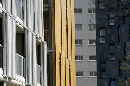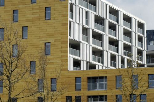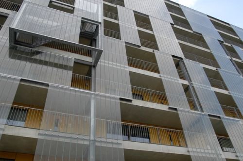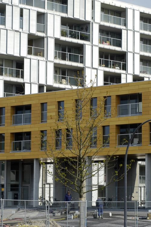 The Carré was designed as a relatively compact block made up of a series of densely stacked blocks. The building floor plate sits on a pedestal containing a parking garage for the inhabitants of the building. Circulation of the building is arranged by three staircases/elevator tracts which can be reached through the courtyard. The footprint of the building is 110 by 80 meters; the Carré reaches up to 10 stories high.