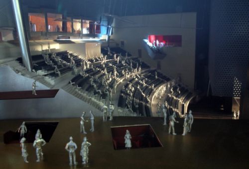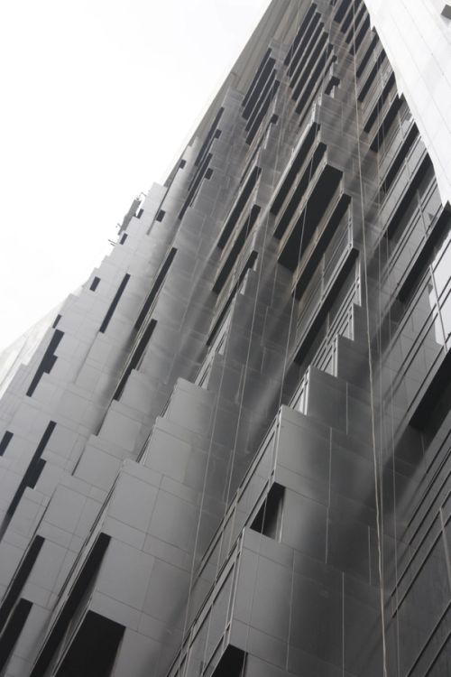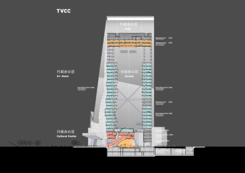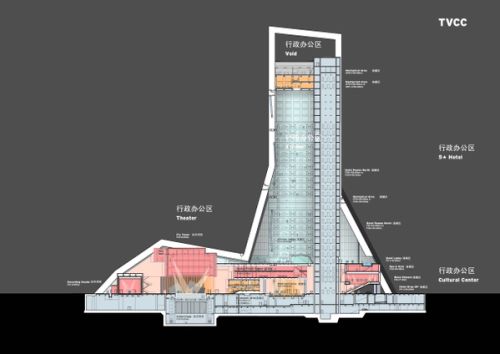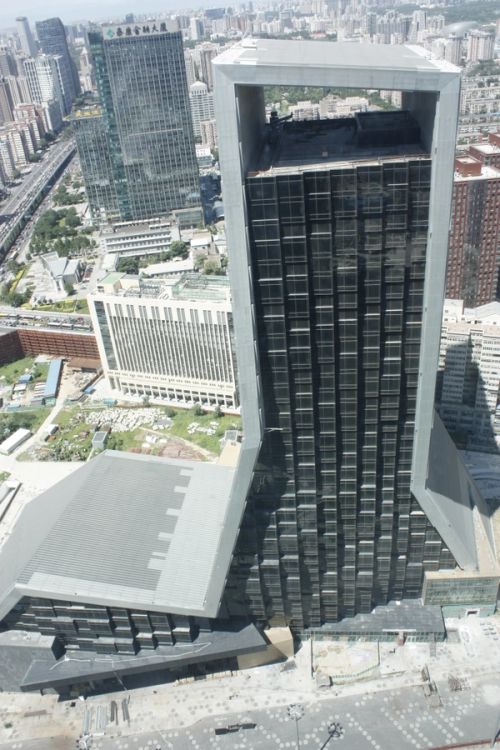 Against the strong architectural shape and definition of CCTV, the adjacent Television Cultural Centre establishes a more informal quality. The multiple functions required by the freely accessible public program - a theatre, digital cinemas, recording studios, press conference and exhibition space, and five-star hotel with ballroom, conference rooms, and spa - are stacked to form an accumulation of structurally independent volumes. A continuous skin encompasses this assemblage: starting from the ground up, the skin extends upwards to form the angular, sloping roof of the long podium, and then becomes the vertical facade of the tower, wrapping up over the top of the building and down the other side, defining the actual shape of the fundamentally shapeless building - a freeze frame of apparent instability.