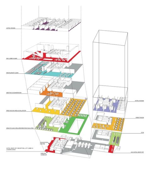 Worldwide, the demand of the "World Class" has led to a proliferation of barely distinguishable complexes that may serve well as 'venues' but which fail to contribute to the specific circumstances of the place they are in. In the masterplan of SICEEP, instead of the generic "World Class" approach, OMA and the consortium have looked for a configuration of convention, entertainment, exhibition, cultural and commercial facilities that offer the most promising conditions for genuine and contextual, site specific interaction within Sydney.