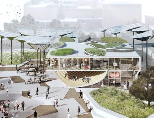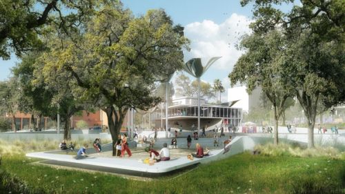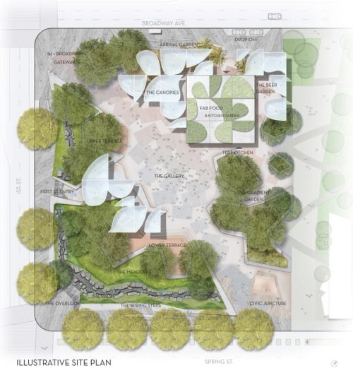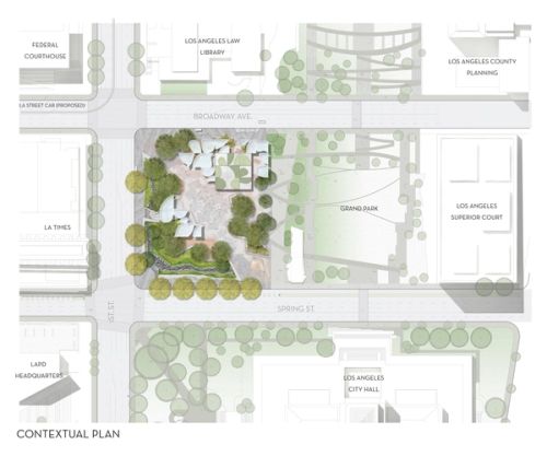 The proposal for the First and Broadway (FAB) Civic Center Park introduces a new type of park space, a respite for downtown LA that celebrates the city's diversity as its greatest asset and promotes civic engagement through highly versatile spaces to experience art, enjoy food and revel in the unique urban setting.