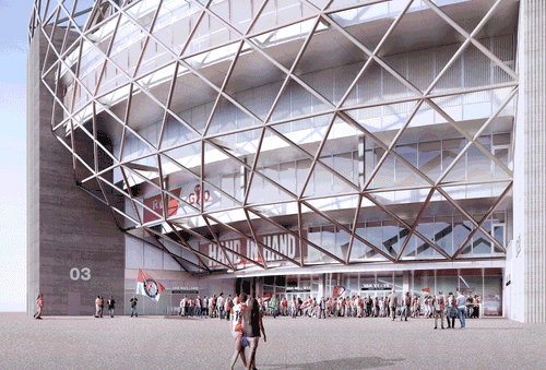Fondly referred to as De Kuip (or the tub) in Rotterdam, Feyenoord’s stadium in the city’s south has been home to the Dutch football club for over eighty years. When completed in 1937, the stadium structure—built entirely with steel and concrete tiers and including a curved, cantilevered stand—was a forerunner in modernist football stadium. Feyenoord’s current ambitions to further strengthen the football club, in combination with the municipality of Rotterdam’s plan to rejuvenate the area of Rotterdam-Zuid, have led to the development of the new Feyenoord Stadium as part of Feyenoord City—a masterplan designed to transform Rotterdam-Zuid into a well-connected and vibrant neighbourhood for sports, recreation, and living.