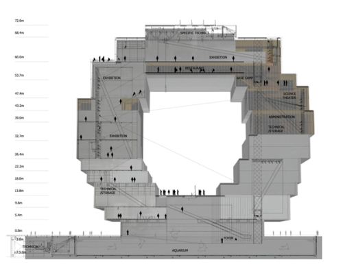The complex, comprising of the Science Center, Aquarium and Science Theatre, is located at the entrance to the Magdeburger harbour and sits at the end point of an urban axis from the inner Alster to the river Elbe. Situated at the waterfront in close proximity to container and cruise ships, the building marks the connection between the harbour and the city.
