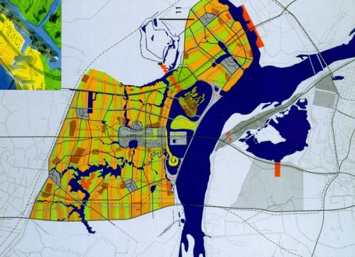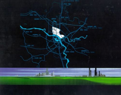 The Riverfront District, conceived as a lake with a chain of islands, shows most explicitly the full integration of water in the urban scheme. Water, to be used for leisure and transport, for promenades and views, becomes part of the qualitative experience of Hanoi.
