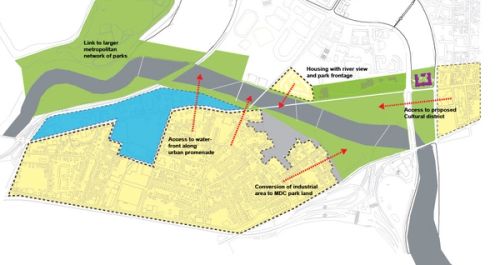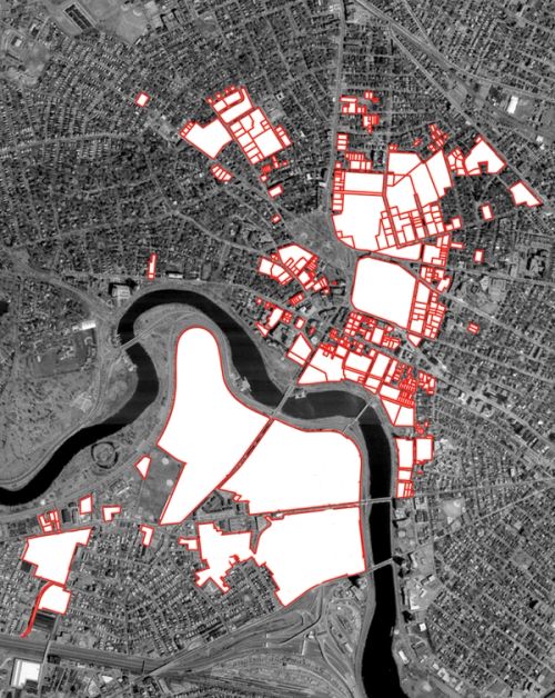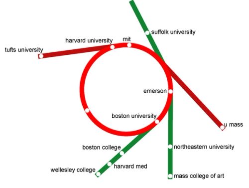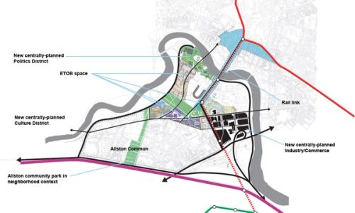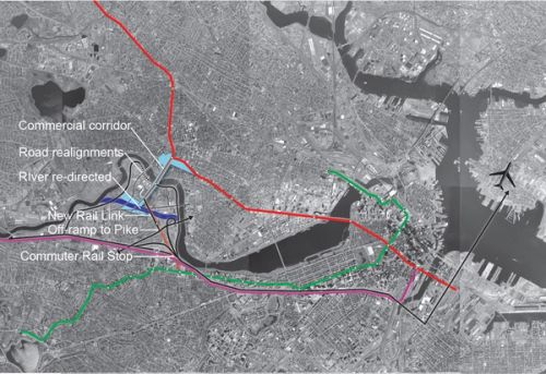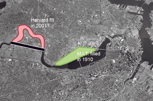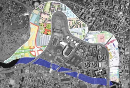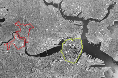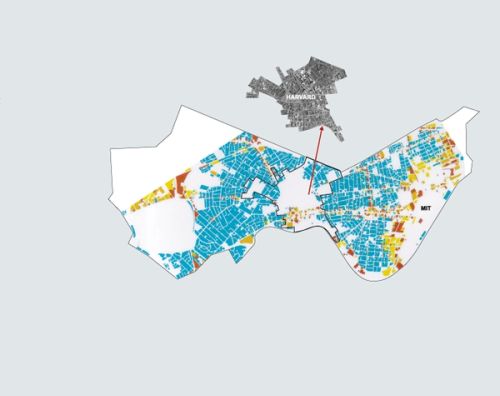 In 2001, AMO was charged to study the development potential of Harvard's holdings in Allston, on the other side of the Charles River. Although Harvard owns more land in Allston than in Cambridge, only 12 percent of its students are schooled there. AMO's planning proposal identifies three different ways of maximizing Harvard's urban development: (a) extension of infrastructure into Allston, (b) diverting the river Charles (Moses Scheme) and (c) establishing an infrastructural framework centred around three zones: Politics, Culture and Industry/Commerce (V Scheme).