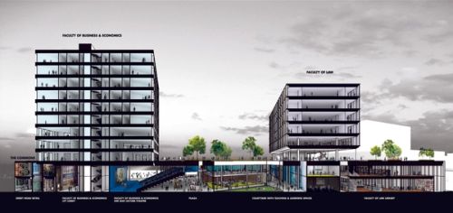 A crucial part of the redevelopment of Monash University's Caulfield campus is the injection of a new building for the Faculty of Business & Economics, including its MBA facilities, and the relocation of the Faculty of Law from Monash's Clayton campus.