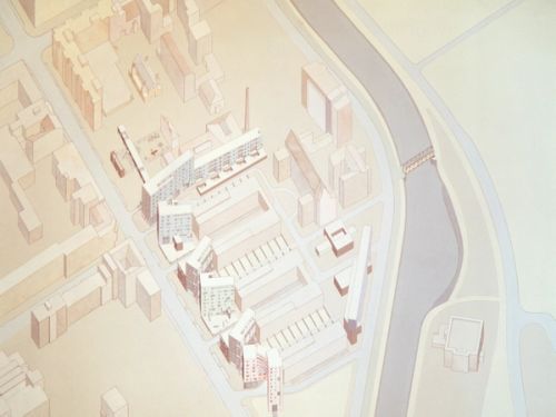 For this development, the Internationale Bauaustellung (IBA) has projected public assisted housing for a narrow triangular site in the South Tiergarten quarter, which was bounded on the south by Lützowstrasse, one of Berlin’s traditional but war damaged streets, to the north by Lützowufer, a tree-lined thoroughfare bordering the idyllic Landwehr canal, beyond which views to the park could be obtained; to the east it bordered on a 19th century pumping station, and to the west is converged towards a small triangular park, facing Lützowplatz (as present a messy traffic intersection).