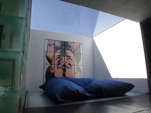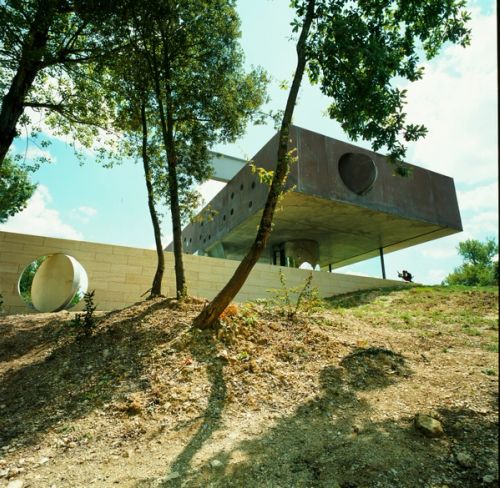 The Maison à Bordeaux is a private residence of three floors on a cape-like hill overlooking Bordeaux. The lower level is a series of caverns carved out from the hill, designed for the most intimate life of the family; the ground floor on garden level is a glass room – half inside, half outside – for living; and the upper floor is divided into a children's and a parents' area. The heart of the house is a 3x3.5m elevator platform that moves freely between the three floors, becoming part of the living space or kitchen or transforming itself into an intimate office space, and granting access to books, artwork, and the wine cellar.