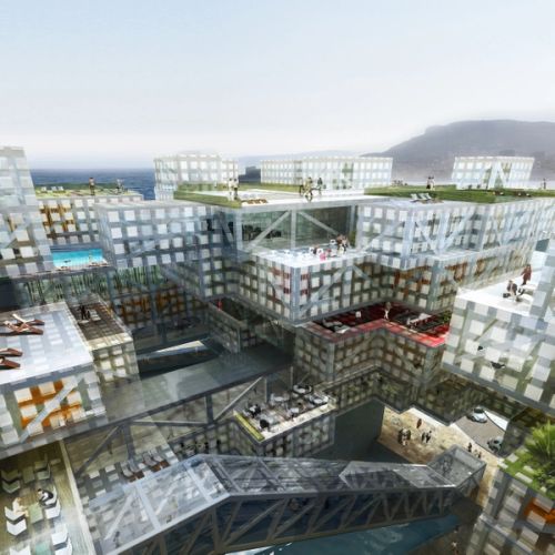 The hotel is the ultimate autonomous object of the urban development: the building floats on top of the water, in the middle of bay of Larvotto. The hotel residence is an autonomous architectural system in levitation. Its activities, its circulations, its uses, gathered and dense, offer a special relationship to calm water, and the landscape. Its principle of formation is a prolongation of the archipelago: the objects interact with each other, freely. The outcome is an unspecified form. This system of assembly is the architectural version of a city: an exceptionally gifted city, carried by a collective intelligence- interior ratios/external, density, vacuums, near/remote…