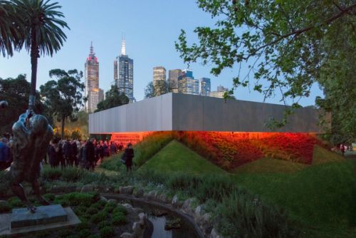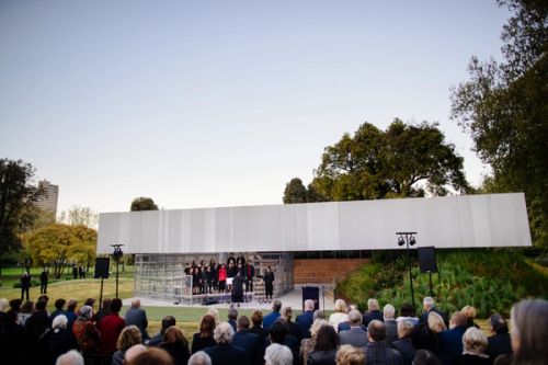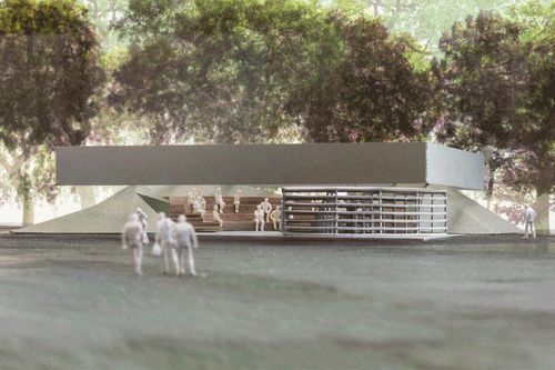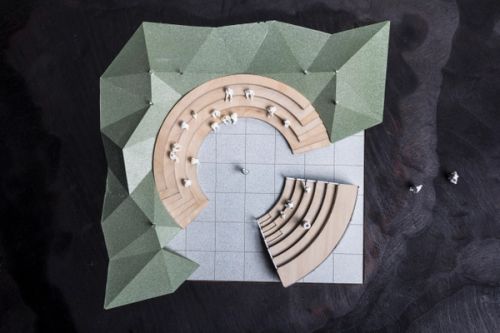 MPavilion 2017 is a public venue with an intimate scale. Located in the Queen Victoria Gardens in the center of Melbourne’s Southbank Arts Precinct, the pavilion intends to draw the community in and act as a cultural laboratory. OMA has designed a temporary structure that, along with providing space for performances, entertainment and events, can also perform itself. The pavilion’s ground surface is shaped by two tribunes, one fixed, the other movable, which together determine the setup of the performance space. The larger static tribune is excavated from the surrounding landscape and embedded in 12 different species of Australian flora, giving a sense of the local setting. The smaller tribune can rotate, allowing it to shift functions from seating to stage and blur the distinction between actor and audience.
