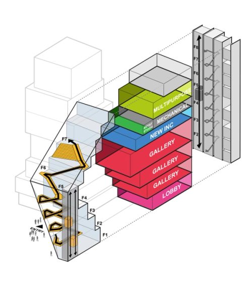 The New Museum designed by OMA / Shohei Shigematsu and Rem Koolhaas will be OMA’s first public building in New York City. The new structure will complement and respect the integrity of the adjoining SANAA-designed flagship building, while asserting its own distinct identity. The seven story, 60,000 square foot building will include three floors of galleries, doubling the Museum’s exhibition space, along with additional space for the Museum’s many community and education programs, a permanent home for NEW INC, as well as increased public amenities and improved vertical circulation.