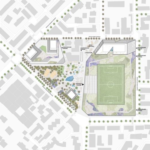 OMA’s redesign of the Selman Stërmasi Stadium in Tirana expands the existing football park and inserts it into a new urban block. This transformation enables the stadium to become a catalyst for closer connections between different neighborhoods in the Albanian capital, emphasizing the role of football as common ground for urban culture.