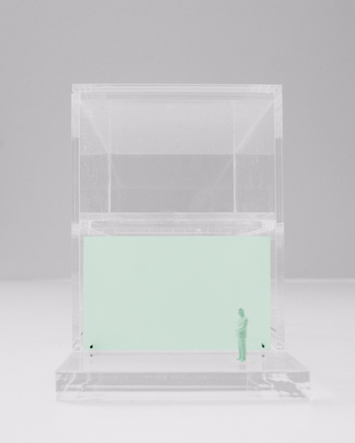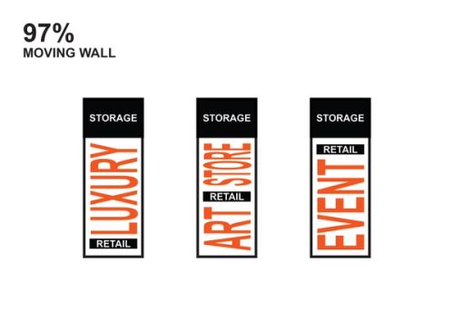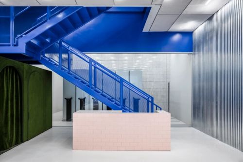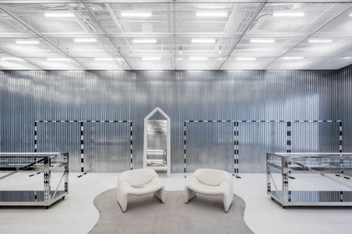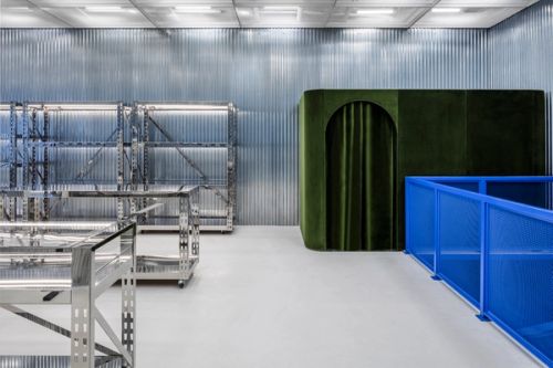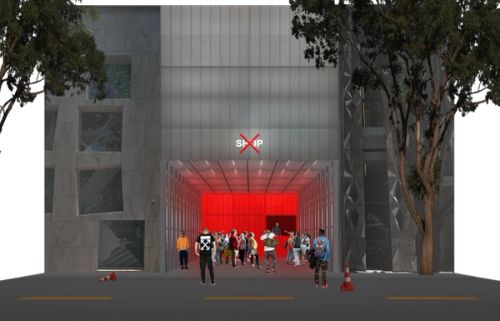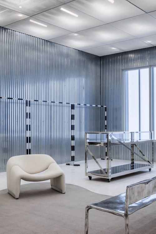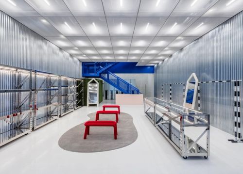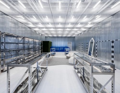 The store holds a number of distinct aesthetic markers, including an opaque polycarbonate facade. Through this exterior layer, Off-White’s new visual marker—a pair of hands extended upward—is visible above a bright orange “X,” another of the brand’s signatures. The ‘X’ overlays the word ‘SHOP’ indicating that this is not simply a shop. Instead Abloh and AMO developed a platform for Off-White’s diverse identity, driven by Abloh’s multidisciplinary engagement.