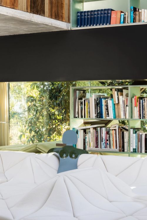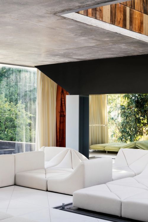 If we consider furniture as the mediation between architecture and real life, then the tension between the openness of the house and its uniquely specific agenda, is most manifest on the middle level, a glass box, opening to all sides, where any furniture is harshly tested and exposed: too traditional, too designed, too fashionable, too tasteful, too modernist, too vintage, too pretty, too cheap...almost always too. And if individual pieces work, it’s hard to make them interact...the mission of the architecture, the richness of the landscape outside almost suggest the middle level would work best without any furniture at all, strictly as architecture...