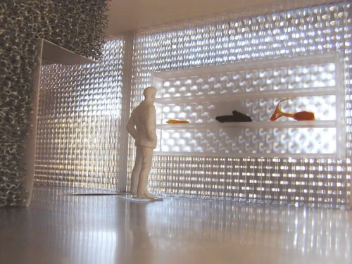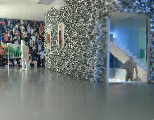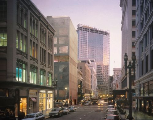 The new 10 storey building in downtown San Francisco [corner of Post Street and Grant Avenue] close to Union Square will be Prada`s Headquarters on the West Coast. Two floating cubes on top of each other contain on 39,000 sqft both store program and offices, along with showrooms, gallery spaces and a VIP penthouse at the top. A public viewing terrace and coffee bar separates both cubes on the 6th floor level.