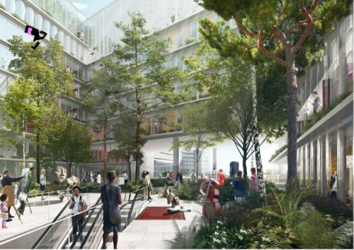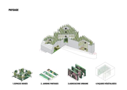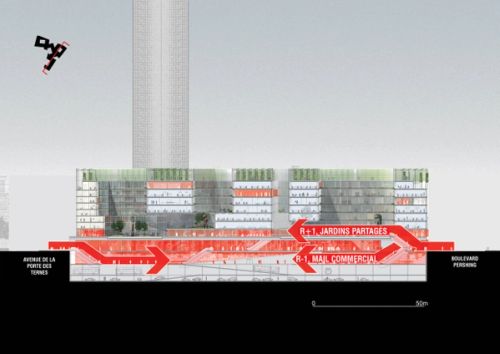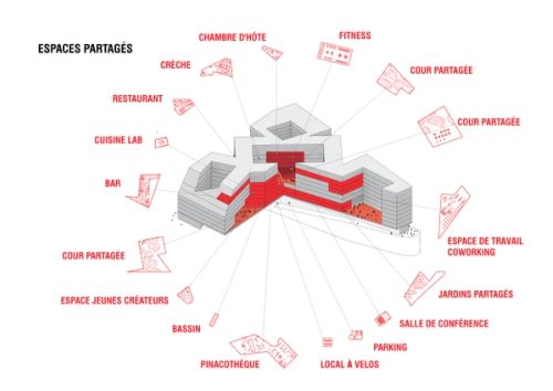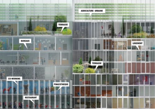 The project PXP: The Shared City proposes to create an urban space dedicated to sharing and innovation. The building, which is positioned on the axis that links the historical tourist areas of Paris and the business district of La Défense, functions as a mixed-use structure with a key position in the development of Greater Paris.