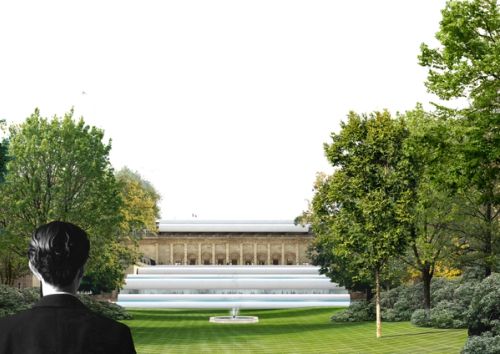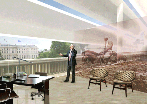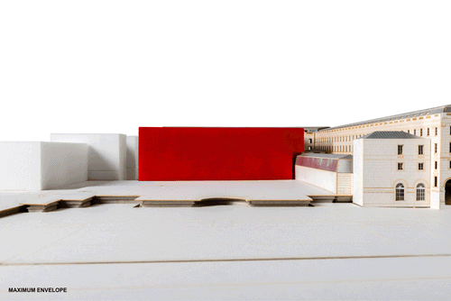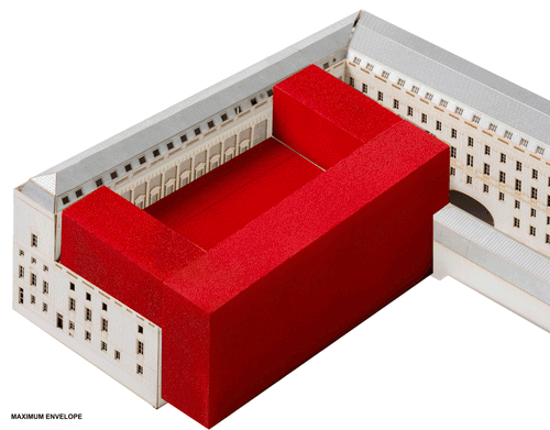 Fully exploited, the North face of the new envelope would obliterate the view of the existing structures on the South and offer to the minister’s view just the brutal face of modernism.