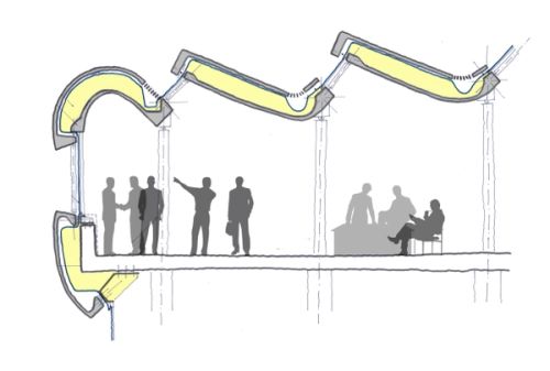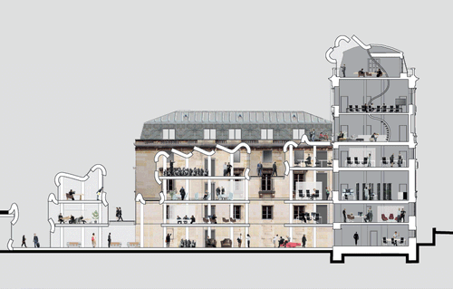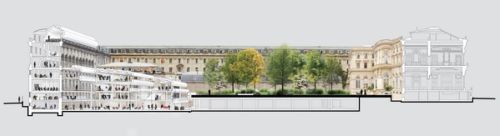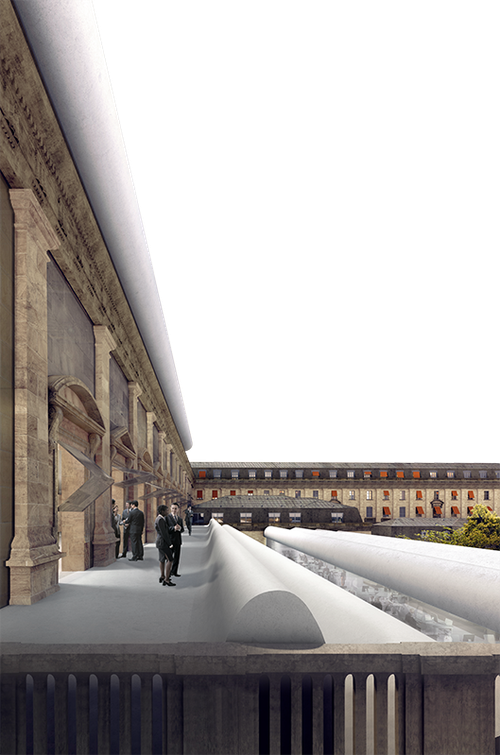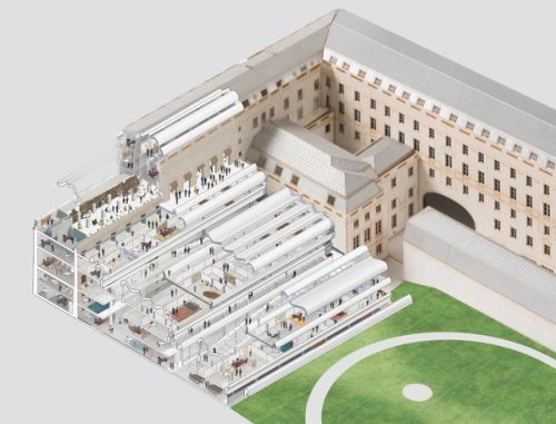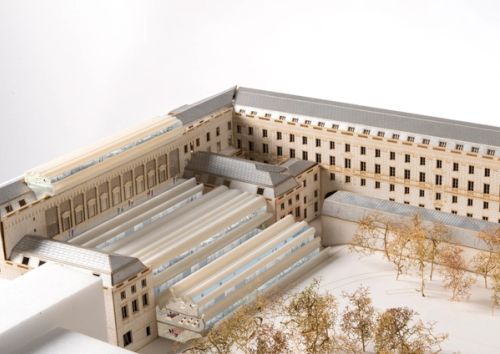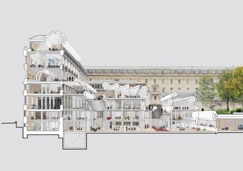 In spite of a manifest ambition to modernize the work environment – and presumably the working methods that are the point of this competition, the considerable volume negotiated with the Architectes des Bâtiments de France (ABF) suggests an organization composed of the same elements as the existing complex, i.e. corridors and separate rooms.