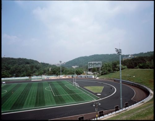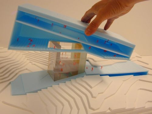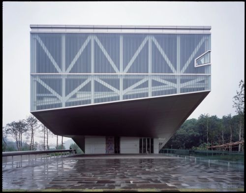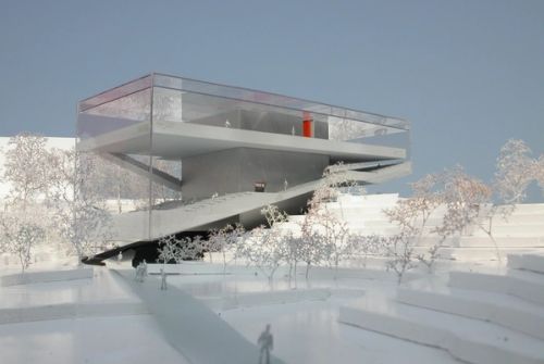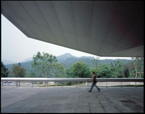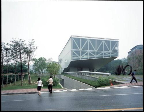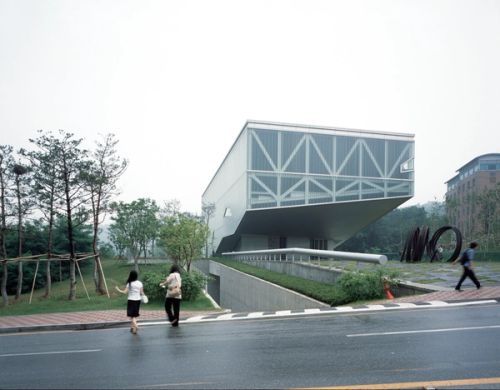 The Seoul National University Museum is defined by its siting on the side of a small hill, close to the entrance of the university. The building's form was conceived as a basic rectangular box, sliced diagonally by the incline of the hill. This form is then raised up on a small central core – the only point of contact with the ground – so the building is nearly all cantilever, extending up and down the hill, following the topography precisely and appearing to hover above it. The museum both defines and defeats the hill, and, by keeping the ground beneath it largely free, becomes an attractive conduit between the university campus and the outside community.