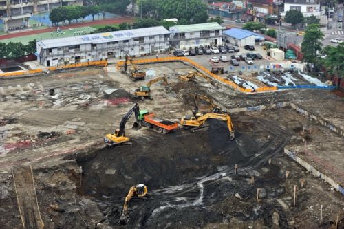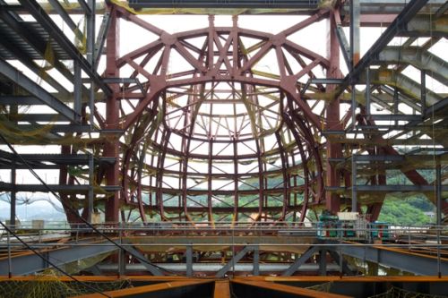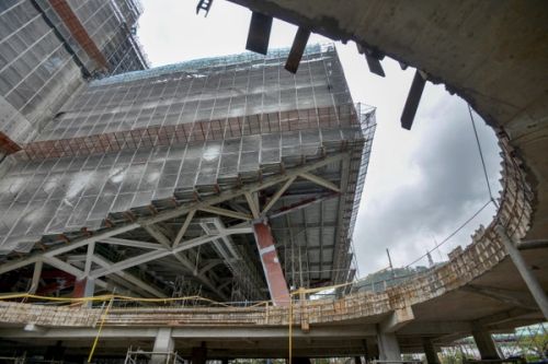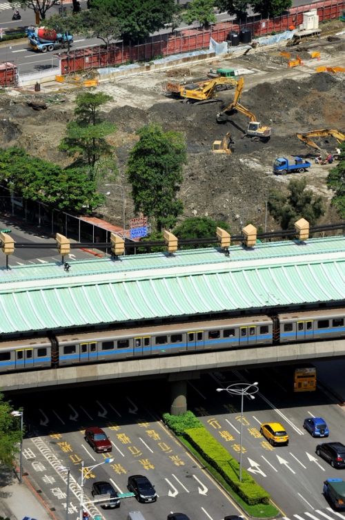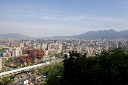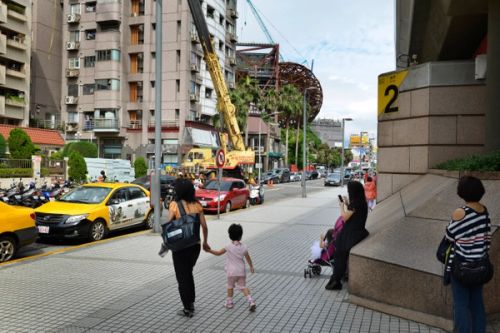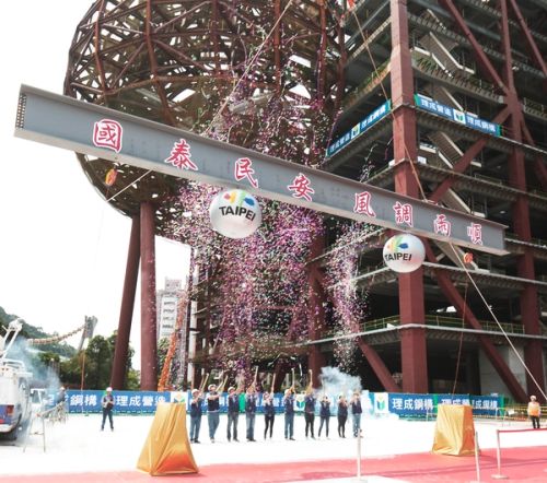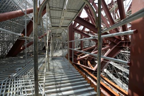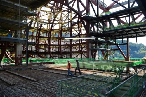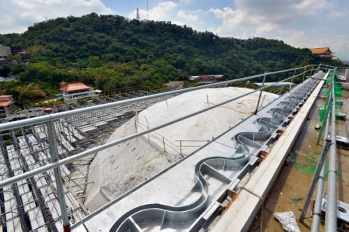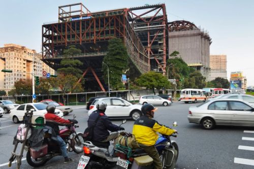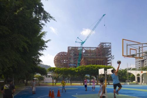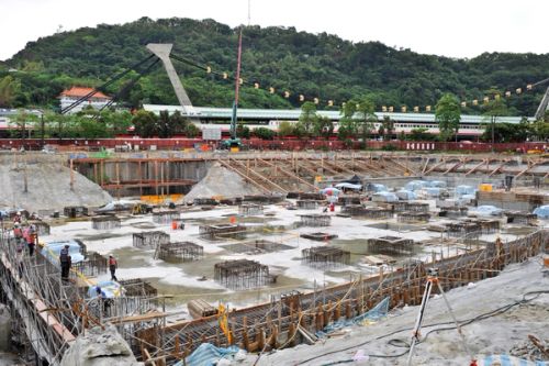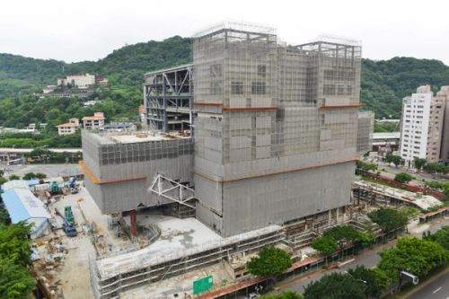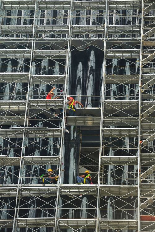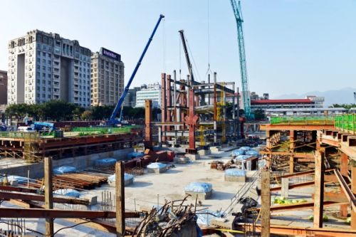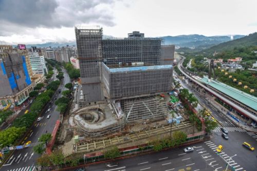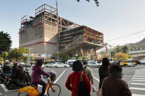 ![A view from North Taipei of facade works ongoing in January, 2016]()