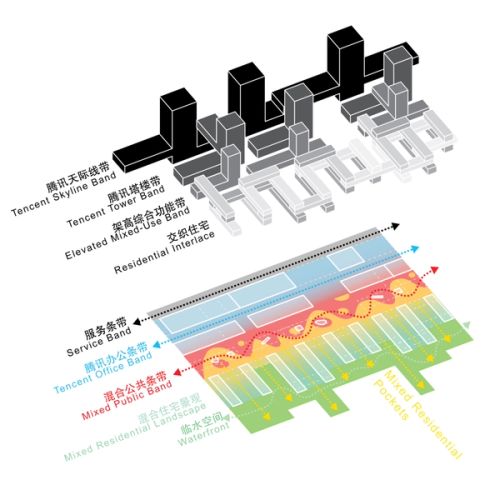 Tencent was founded in 1998 and is currently one of the world’s largest internet companies. In anticipation of future growth, Tencent decided to develop a new campus for its 80,000 employees, a quarter of whom will live on site. According to the competition brief, the new campus will have a GFA of 2.5 million square-meter, and form an independent Tencent City in Shenzhen’s Qianhai District. In the design competition, OMA was confronted with several questions: How to create a masterplan to showcase the identity of Tencent while allowing ultimate flexibility over time? How to create a masterplan for a company, which is changing its own structure at a speed faster than that of designing a master plan? How to make the innovation industry in China accessible to a greater public?