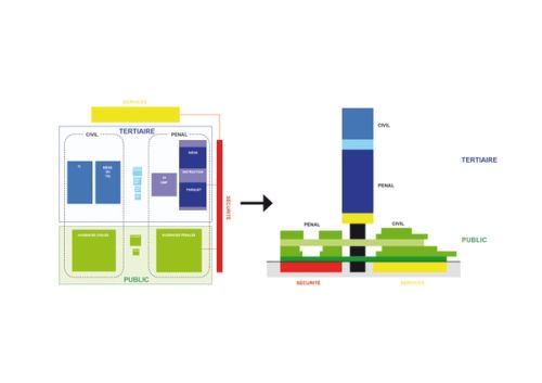 How can architecture represent the essence of law today, in a world focusing on decentralization and proximity? Our project for the new Parisian Courthouse is a unitary building where the program is organized into three clearly identified parts: Civil, Criminal and Offices.