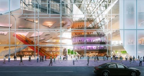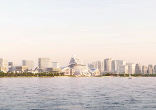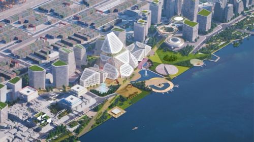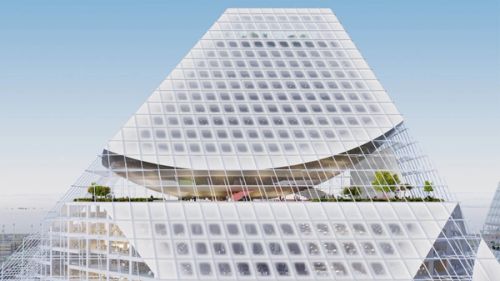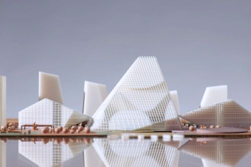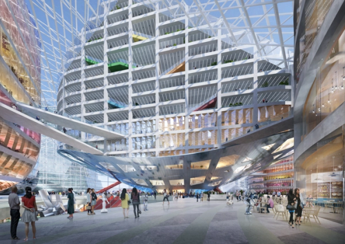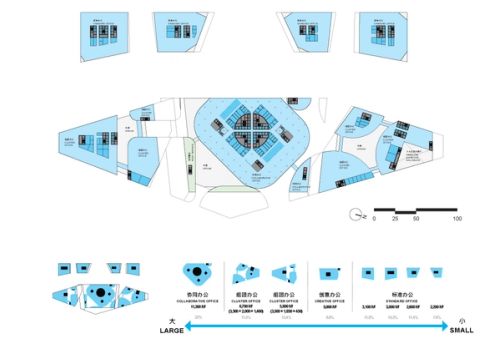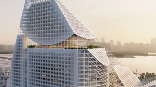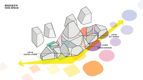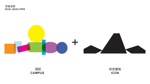 The impressive scale of the Shenzhen Technology Masterplan development has allowed for an effective embrace of both strategies: a campus of iconic buildings. For the masterplan’s central headquarters building, we propose to maintain these qualities by fitting a vertically arranged campus of office volumes into a singular, iconic envelope to create a natural “summit”.