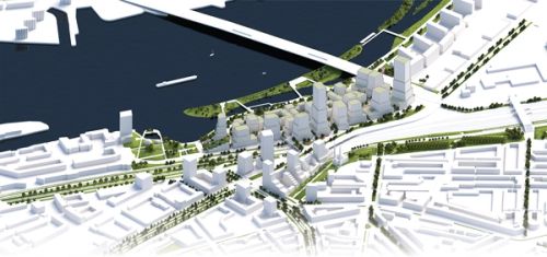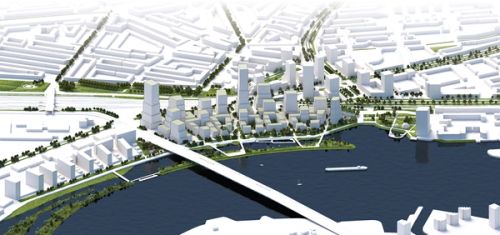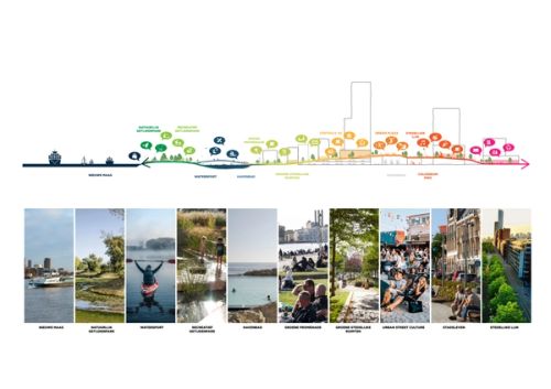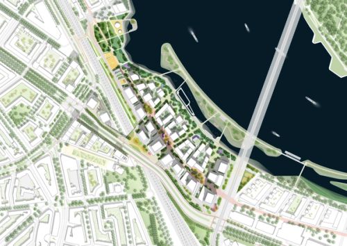 The Waterkant was developed following the decision to put the construction of a new stadium in the Feyenoord City on hold. In collaboration with EFFEKT and LOLA, OMA has taken the opportunity to explore a new urban planning approach for a high-density neighbourhood. Located on the Nieuwe Maas riverbank – next to the newly planned bridge and facing a future tidal park with recreational water park – the Waterkant will be a new urban center integrated with its surroundings both architecturally and socially. Public space, landscape features, and buildings will create a place with a unique character – a waterfront attraction for the residents and visitors from Rotterdam and beyond.