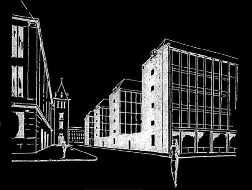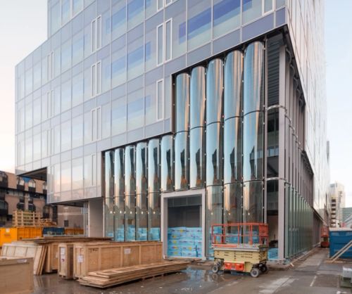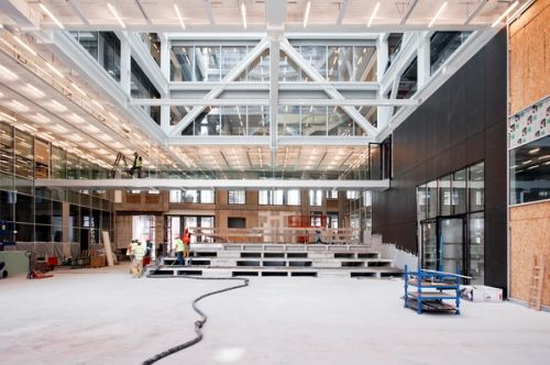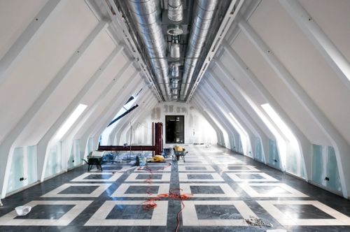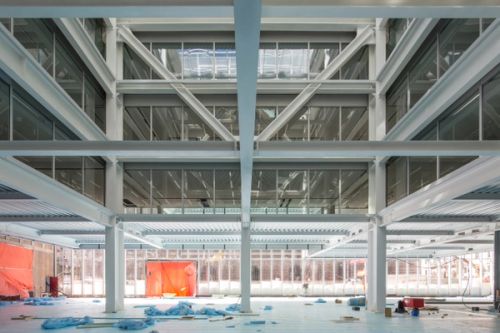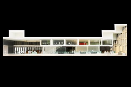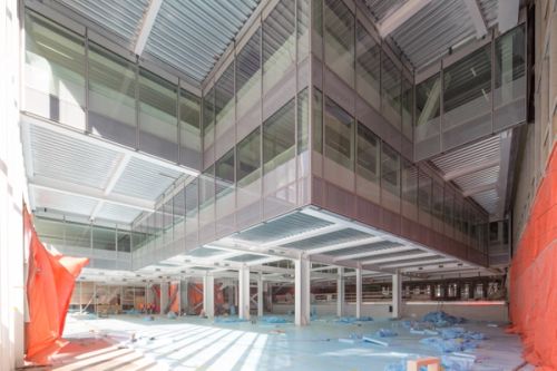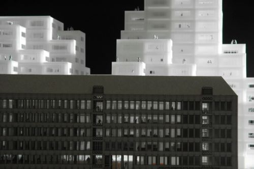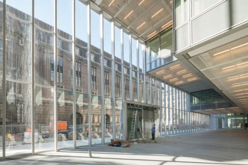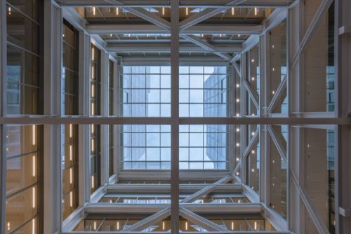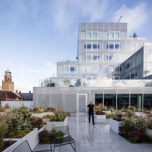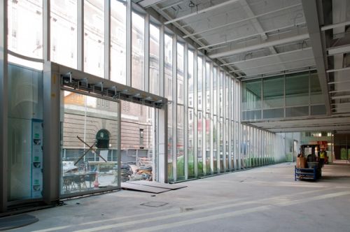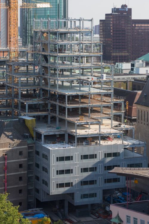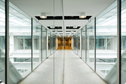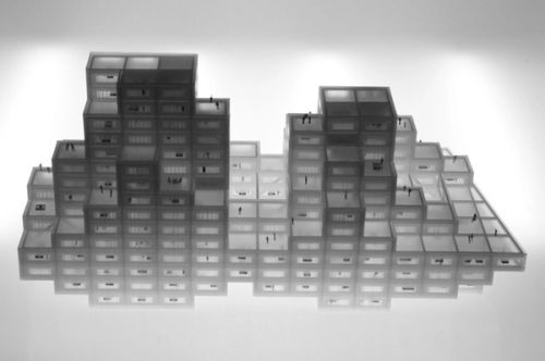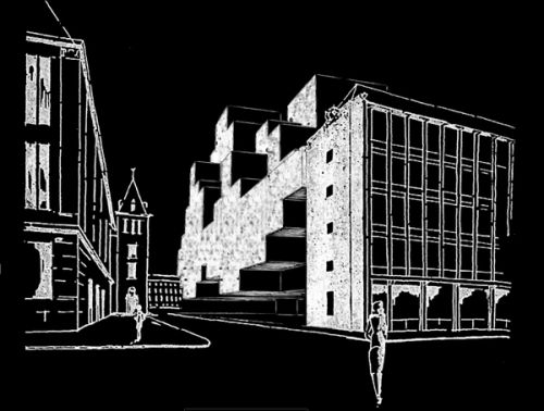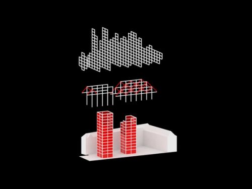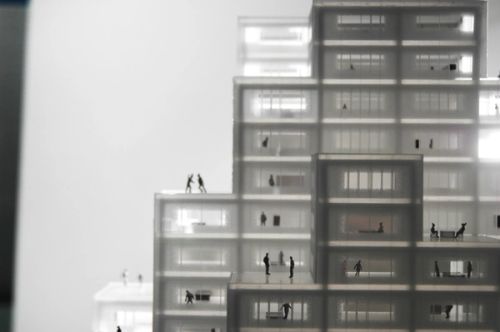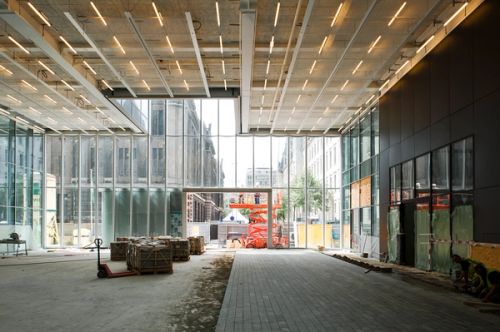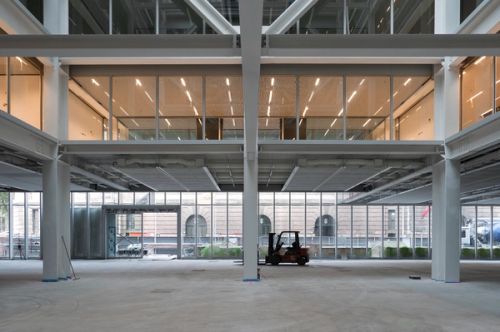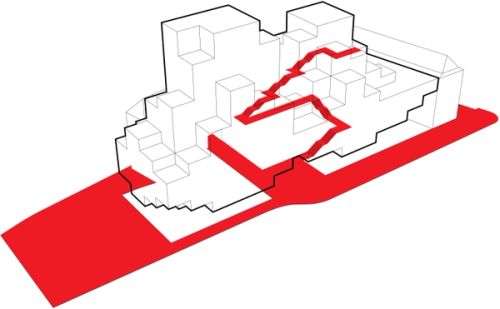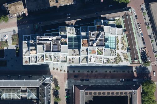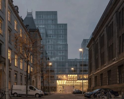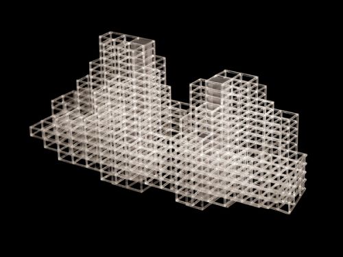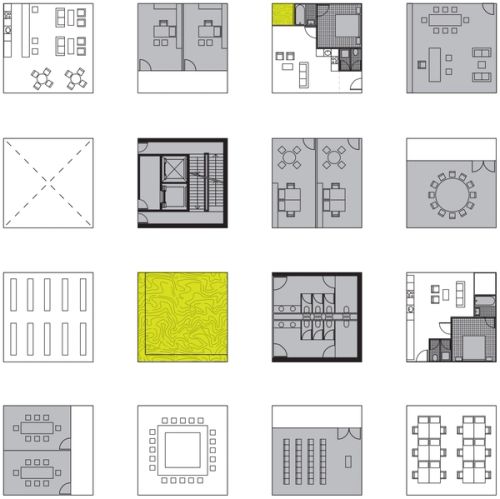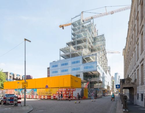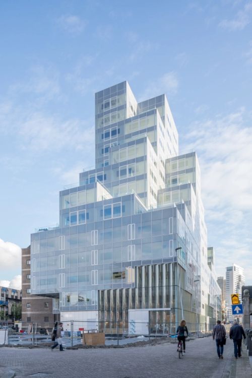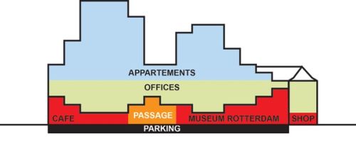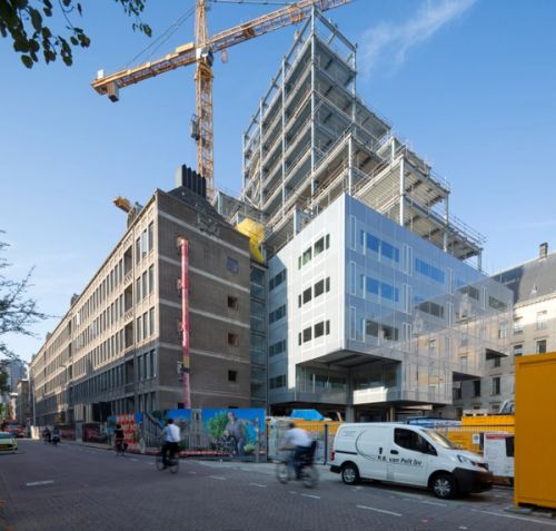 For Rotterdam's Timmerhuis, a new building for the city hall that accommodates municipal services, offices, and residential units, OMA conceived a modular building with repeated units gradually set back from the street as they rise into two irregular peaks. The building's composition of smaller cells creates an impressive, complex form when viewed from Coolsingel, one of Rotterdam's main arteries, and allows for subtlety and adaptability as the new building meets the Stadstimmerhuis (a municipal building, from 1953), which surrounds it on two sides.