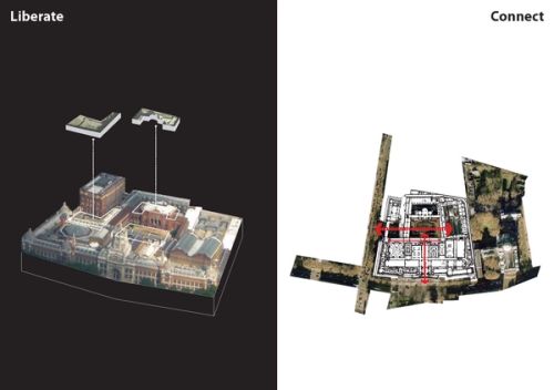 The need for additional space for major exhibitions at the V&A suggests a strategy for future expansion and reorganization. Instead of filling courtyards with multi-story museum spaces, we propose liberating courtyards that are currently filled in with single level structures and utilizing the underground spaces beneath them. In this way, we provide new outdoor spaces for museum visitors, open up historic interiors, and create a new underground network of spaces - accessible from multiple points within the museum - for exhibitions, conservation, exhibition preparation, and storage. In addition, we propose a new East-West axis for the V&A that extends from Exhibition Road to the historic heart of the Museum in North and South Courts.