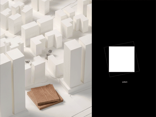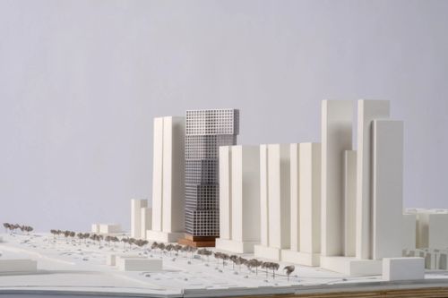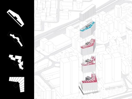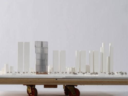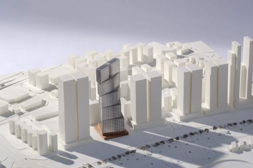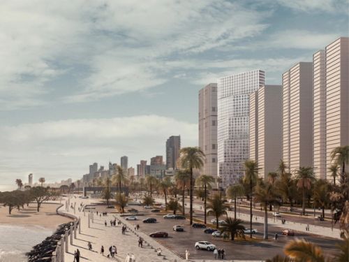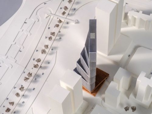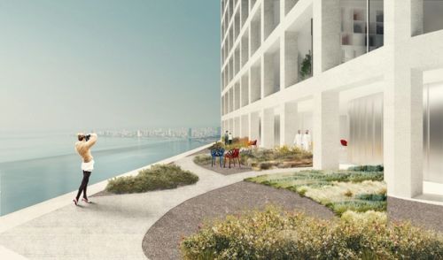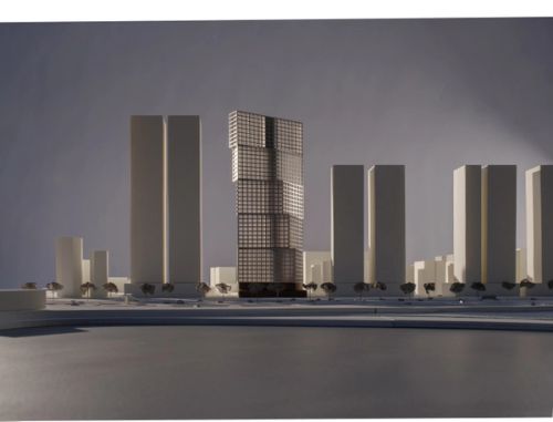 The design for the Wafra tower, a residential tower in the Hessa Al Mubarak District along the Kuwait City waterfront, consists of five residential blocks forming a stepped sequence, which modulates from an L-shaped volume to slab. This structure maximizes occupancy on the lower floors and optimizes views along the vertical axis of the building. The apartment blocks offer views on both the seafront and the city and are connected by an exposed, monolithic core.