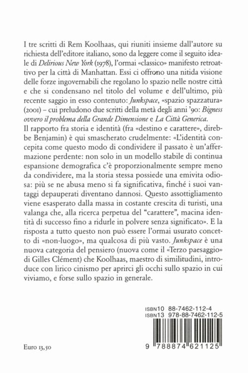 If space-junk is the human debris that litters the universe, junk-space is the residue mankind leaves on the planet. The built ... product of modernization is not modern architecture but Junkspace. Junkspace is what remains after modernization has run its course or, more precisely, what coagulates while modernization is in progress, its fallout. Modernization had a rational program: to share the blessings of science, universally. Junkspace is its apotheosis, or meltdown... Although its individual parts are the outcome of brilliant inventions, lucidly planned by human intelligence, boosted by infinite computation, their sum spells the end of Enlightenment, its resurrection as farce, a low-grade purgatory…