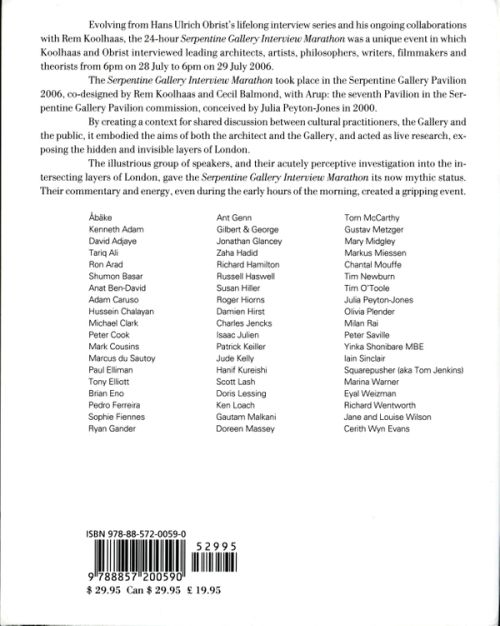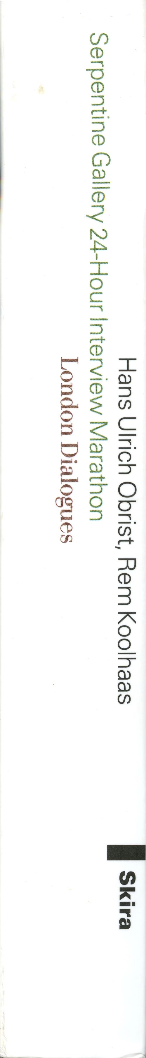 Evolving from Hans Ulrich Obrist’s lifelong interview series and his ongoing collaborations with Rem Koolhaas, the 24-hour Serpentine Gallery Interview Marathon was a unique event in which Koolhaas and Obrist interviewed leading architects, artists, philosophers, writers, filmmakers and theorists from 6pm on 28 July to 6pm on 29 July 2006. London Dialogues transcribes these interviews from protagonists of the British architectural, political, and artistic scene, including Brian Eno, Zaha Hadid, Doris Lessing, Damien Hirst, and Gilbert and George, amongst others.